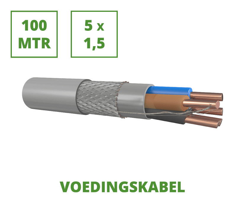 100 meter 1 kV gewapende voedingskabel. De kabel is voorzien van 5x1,5 mm² aders. De voedingskabel is geschikt voor laagspanningsinstallaties tot 1000 V. Verder kan de kabel gebruikt worden in ruimtes waar er sprake moet zijn van elektrische en mechanische bescherming.