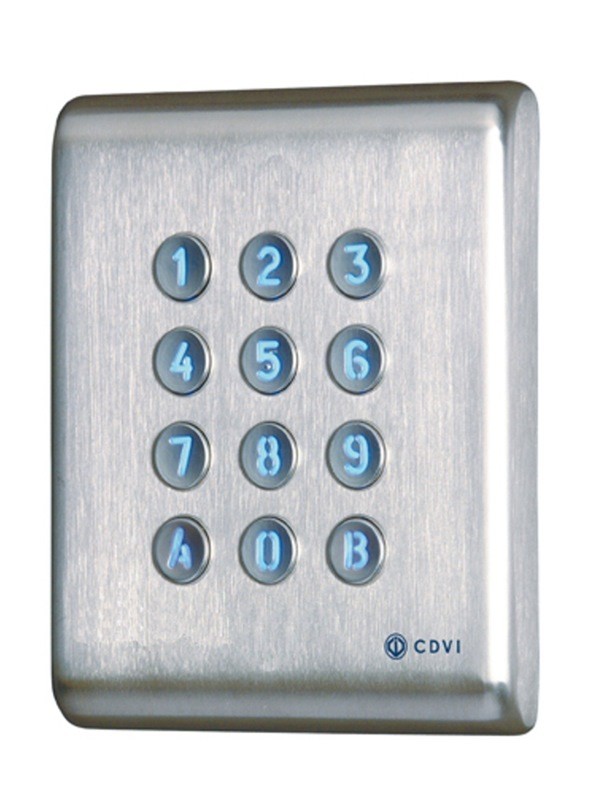 Vandalismebestendig RVS Cdvi codepaneel KCIN opbouw met blauwe (LED) verlichte RVS toetsen. Het paneel heeft 2 relaisuitgangen en een uitbouwdiepte van slechts 14 mm.