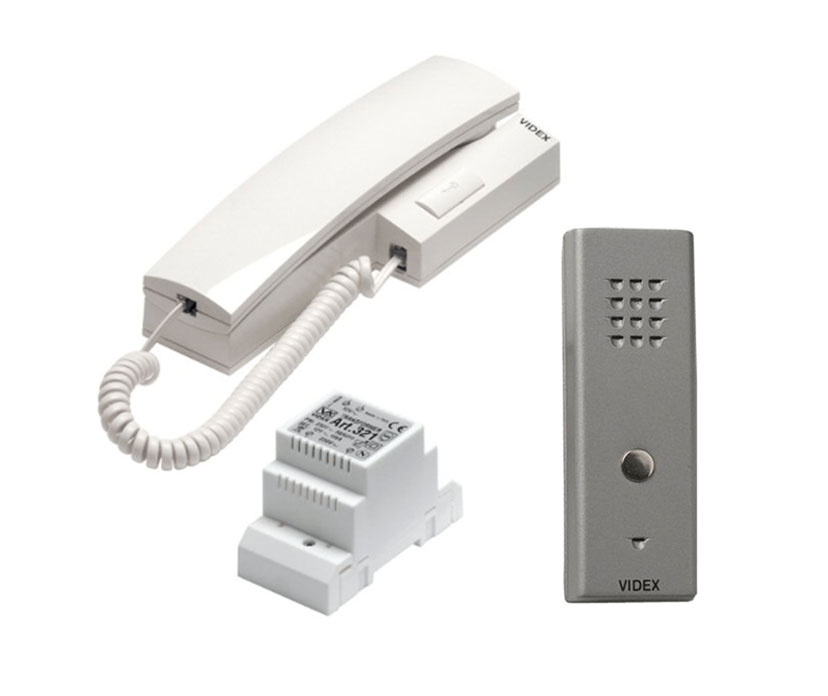 Complete VIDEX intercomset met extra smalle buitenpost. Deze set bestaat uit een buitenpost opbouw, binnenpost wandmontage en voeding. De buitenpost heeft 1 beldrukker. De robuuste buitenpost is gemaakt uit één stuk gegoten aluminium legering, waardoor deze erg stevig is. Door zijn smalle design past de buitenpost exact op een kozijn. Met diverse functies waaronder genereren van elektronische oproeptoon, deur open knop, volumeregeling en ingebouwd relais voor bedienen van een elektrisch slot.