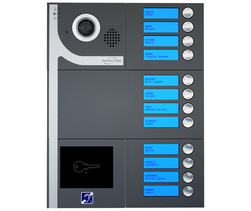 Elke van de twaalf beldrukkers beschikt over een compact LCD-scherm waarop namen digitaal worden weergegeven. Dit maakt papieren etiketten overbodig. Beheerders kunnen eenvoudig en op afstand naamwijzigingen doorvoeren via de Intratone-app of de online beheerdersomgeving – snel, overzichtelijk en zonder fysieke aanpassingen aan het toestel.