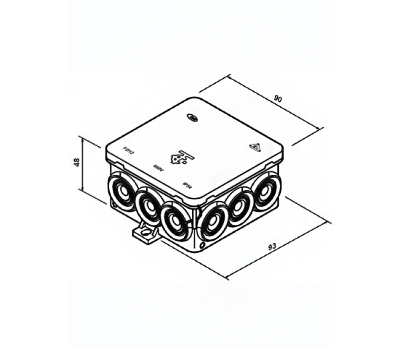 Kabeldoos met een afmeting van 93x90x48 mm. De lasdoos is geschikt voor nominale spanning tot 400V. Er zijn 12 invoermogelijkheden voor leidingen tot 2,5 mm².