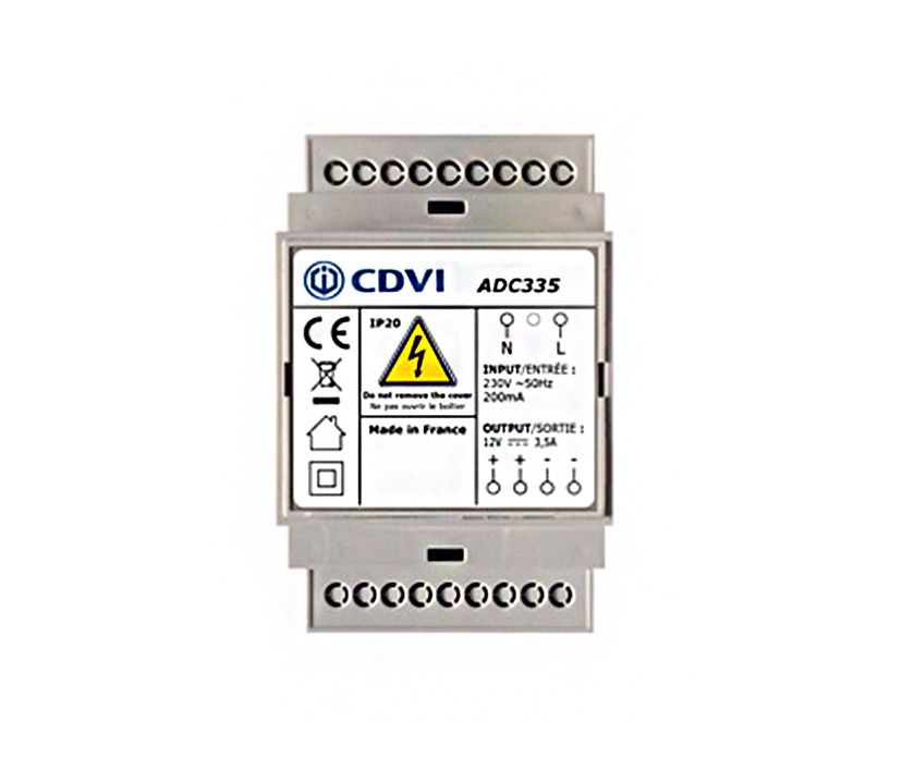 Voeding 12 Vdc - 3,5A voor het aansluiten van kleefmagneten. Ingangsspanning 230V. De ingangen en uitgangen worden beschermd door zekeringen. Na overbelasting of kortsluiting wordt de verbinding met het netwerk gedurende 1 minuut verbroken om de zekering te reseten. De groene LED geeft aan dat er uitgangsstroom aanwezig is.