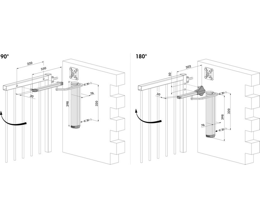 Uniek aan dit model is de speciaal ontwikkelde arm, die rond de muur of paal draait. Hierdoor blijft een grote openingshoek behouden, terwijl de poort altijd soepel en gecontroleerd sluit.