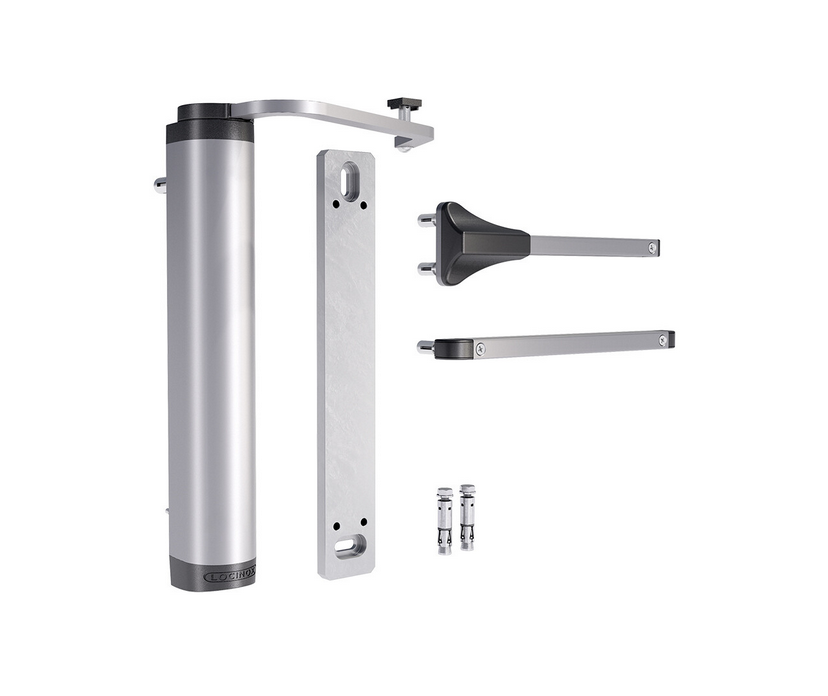 Een krachtige en veelzijdige poortsluiter voor muurmontage in het zilver.