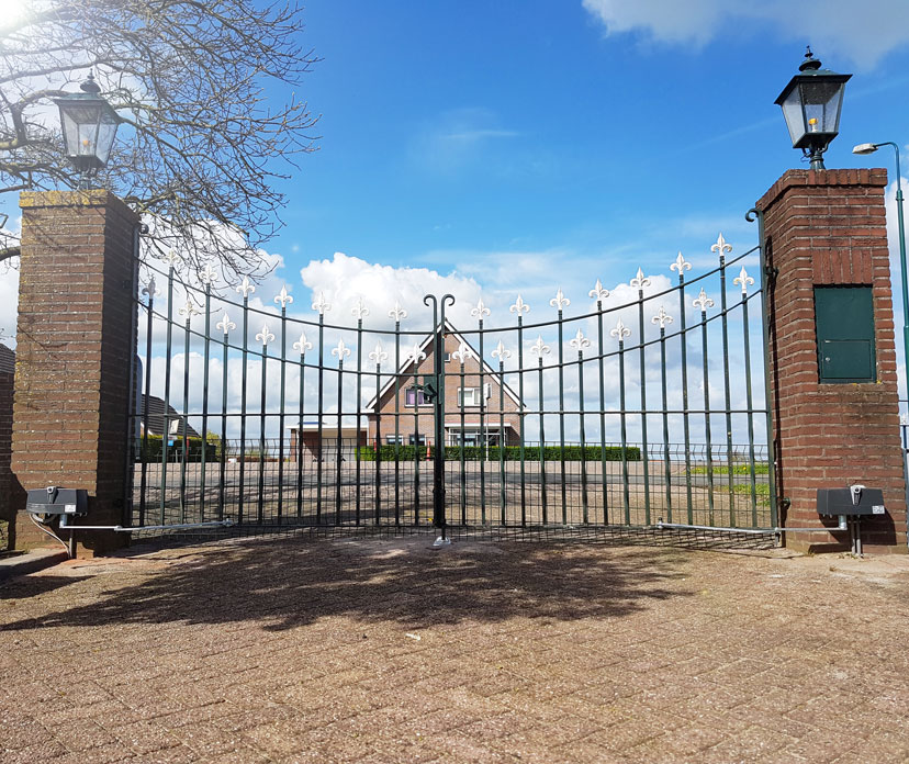 De kit PREMIER45E24 is geschikt voor draaipoorten met een maximale vleugellengte van 3 mtr. De maximale vleugellengte is afhankelijk van het gewicht van de poort. De 24V motoren zijn veilig en snel. Deze motoren met knikarm zijn speciaal ontworpen voor poorten tussen grote kolommen, waar lineaire poortopeners niet kunnen worden toegepast. De motoren kunnen zowel rechts als links worden geplaatst. De poort kan bij stroomuitval handmatig worden geopend met behulp van het ontgrendelingsmechanisme met sleutel. De BRAINY24 is een uitgebreide digitale sturing met alle mogelijke functies en is eenvoudig te programmeren via een display. De 433,92 Mhz ontvanger is ingebouwd in de sturing. Er wordt standaard een 2-kanaals handzender meegeleverd met unieke rolling code. Wanneer er tijdens het bewegen obstakels gedetecteerd worden zorgen de meegeleverde PUPILLA fotocellen voor omkering van de poort.