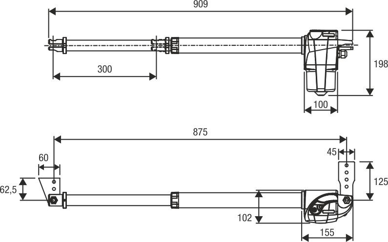 De BILL30M DX - rechtse motor met een slag van 300 mm is geschikt voor poortvleugels en dubbele (houten) garagedeuren, de maximale vleugellengte is 2,5 mtr. Deze motor is bruikbaar voor draaipoorten met kolommen kleiner dan 150x150 mm. De slanke aluminium behuizing bevat uitsluitend hoogwaardige stalen en bronzen onderdelen, dit garandeert een lange levensduur. Een DX motor wordt gemonteerd aan de rechterkant (de vleugel draait naar u toe).