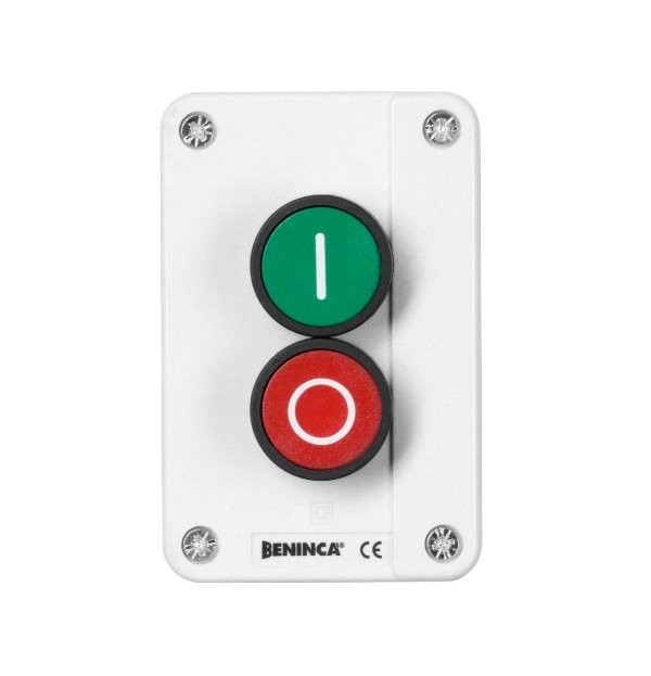 Bedieningspaneel opbouw met een stevige rode en groene drukknop. Het paneel heeft 1 NO contact en 1 NC contact.