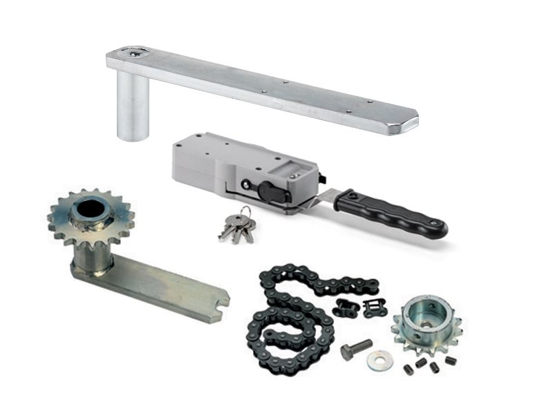 De SB.180.K ontgrendelingsset kan worden toegepast wanneer de poort meer dan 110 graden open moet kunnen. Met deze set ontstaat de mogelijkheid voor opening tot 180 graden. Deze arm is in plaats van de normale ontgrendelingsarm SB.DU350. Deze ontgrendelingsset bestaat uit een ontgrendelingssysteem met persoonlijke sleutel, de onderdelen die nodig zijn om de motor te verbinden aan de poort, een ketting en bijbehorend tandwiel. In geval van spanningsuitval kan de poort handmatig ontgrendeld worden door het afsluitklepje opzij te schuiven en de sleutel in de opening te steken en om te draaien. Op dezelfde manier kan de poort ook weer vergrendeld worden, zodat deze weer automatisch bediend kan worden.