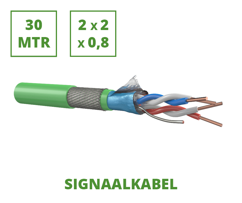 Signaalkabel met een lengte van 30 meter. De gewapende signaalkabel is voorzien van een groene mantel en aders van 2x2x0,8 mm². Deze signaalkabel is geschikt voor het aansluiten van fotocellen.