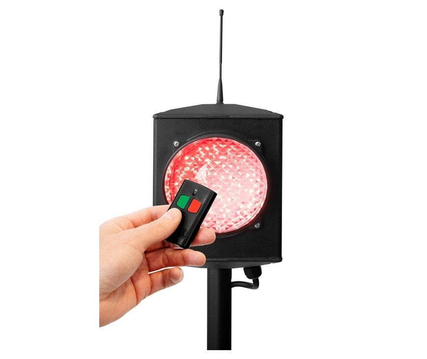 Complete set met verkeerslicht, zuil en afstandsbediening. De set wordt gebruiksklaar geleverd. Hiermee kan eenvoudig het aantal personen worden gedoseerd. De handzender heeft 2 knoppen waarmee het verkeerslicht op groen of rood kan worden gezet. Het verkeerslicht is een Twin Color LED lamp met rood en groen. Het licht is voorzien van een aansluitkabel met 230V stekker aansluiting.