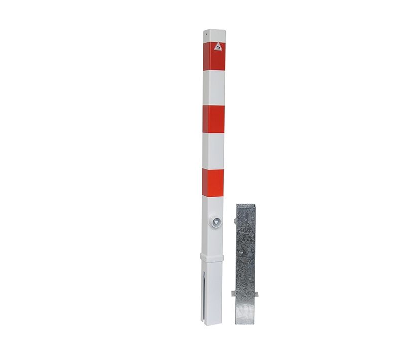 Vierkante parkeerpaal 70x70 mm in de kleur rood/wit. De parkeerpaal is uitneembaar en te ontgrendelen met behulp van een driehoekslot. Het vergrendelen gaat automatisch door middel van het zelfsluitende slot. De parkeerpaal is wit gecoat en voorzien van rode reflecterende markeringen. De parkeerpaal wordt geleverd inclusief sokkel.