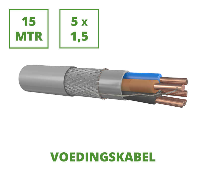 Voedingskabel met een lengte van 15 meter. De 1 kV voedingskabel is gewapend en voorzien van 5x1,5 mm² aders. De kabel is geschikt voor laagspanningsinstallaties tot 1000 V en gebieden waar mechanische en elektrische bescherming moet zijn.